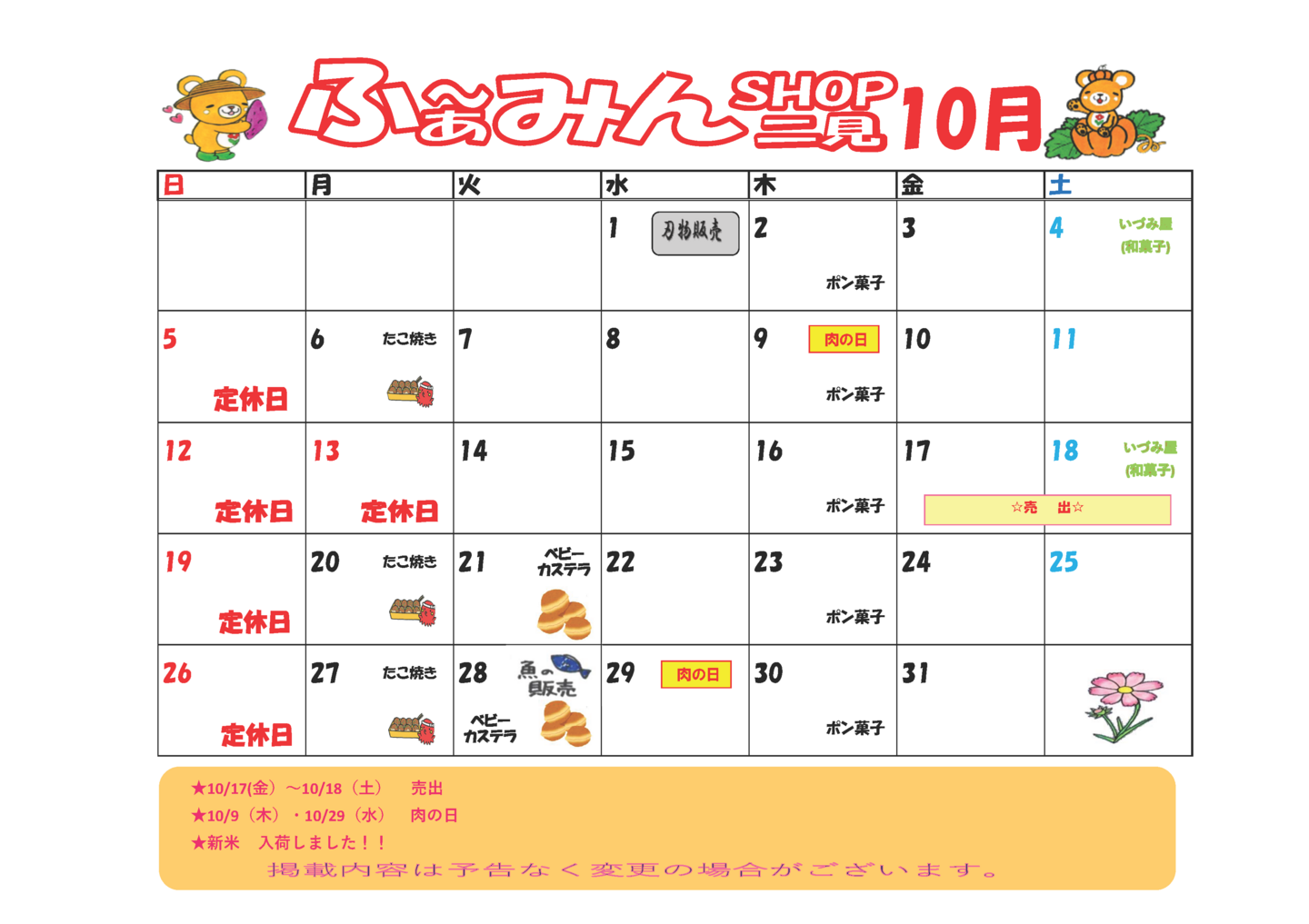 - こんにちは、ふぁ~みんSHOP二見の上村です。当店は、小さな店舗ですが季節ごとに新鮮な野菜をたくさん品揃えしています。旬の季節には、生産者の方が朝早くからキャベツ・スィートコーン・ブロッコリー・葉玉ねぎ等を収穫し豊富に入荷します。又、店舗は海に近く海苔の養殖が盛んに行われ海苔等の加工品の品揃えも充実しています。兵庫南館内からは、地場の新鮮な野菜や切り花、お弁当、パン類、農産物加工品が物流便で届きます。生産者、職員一同お客様のご来店を心よりお待ちしております。