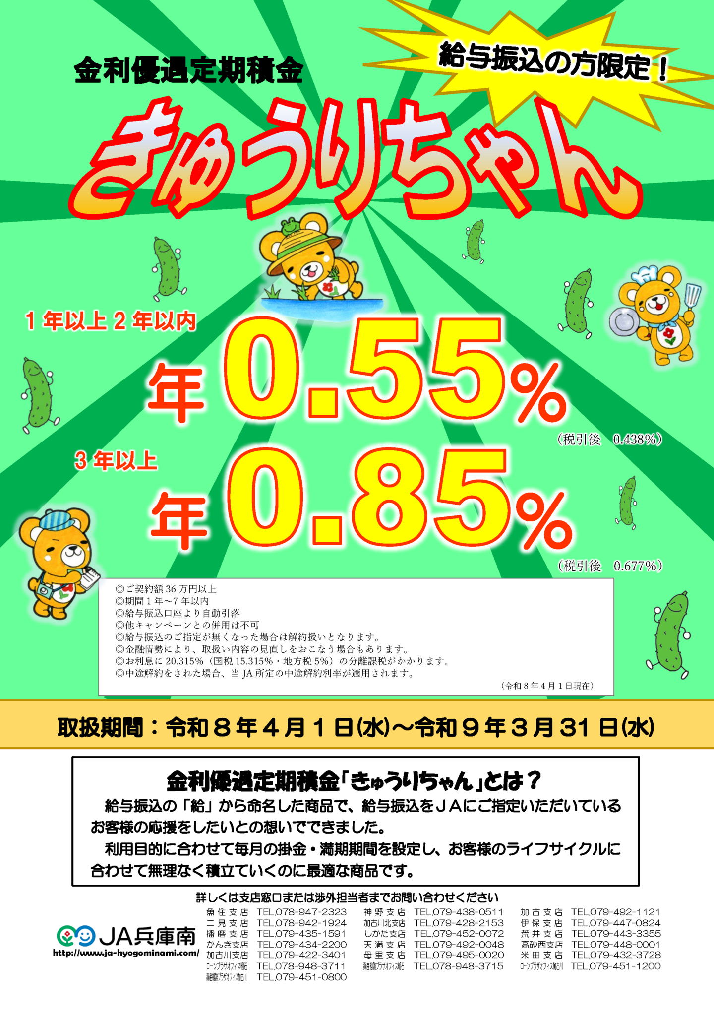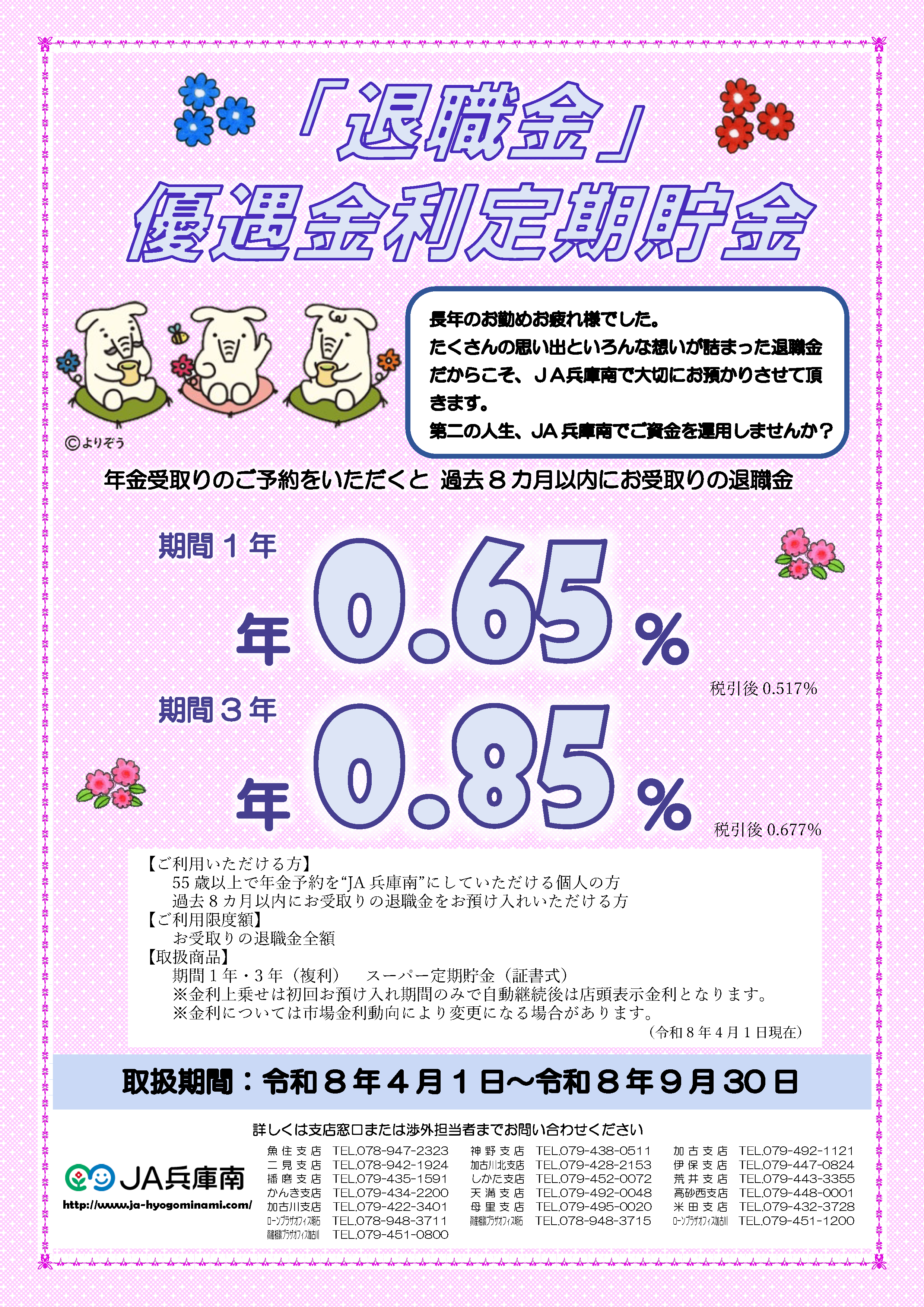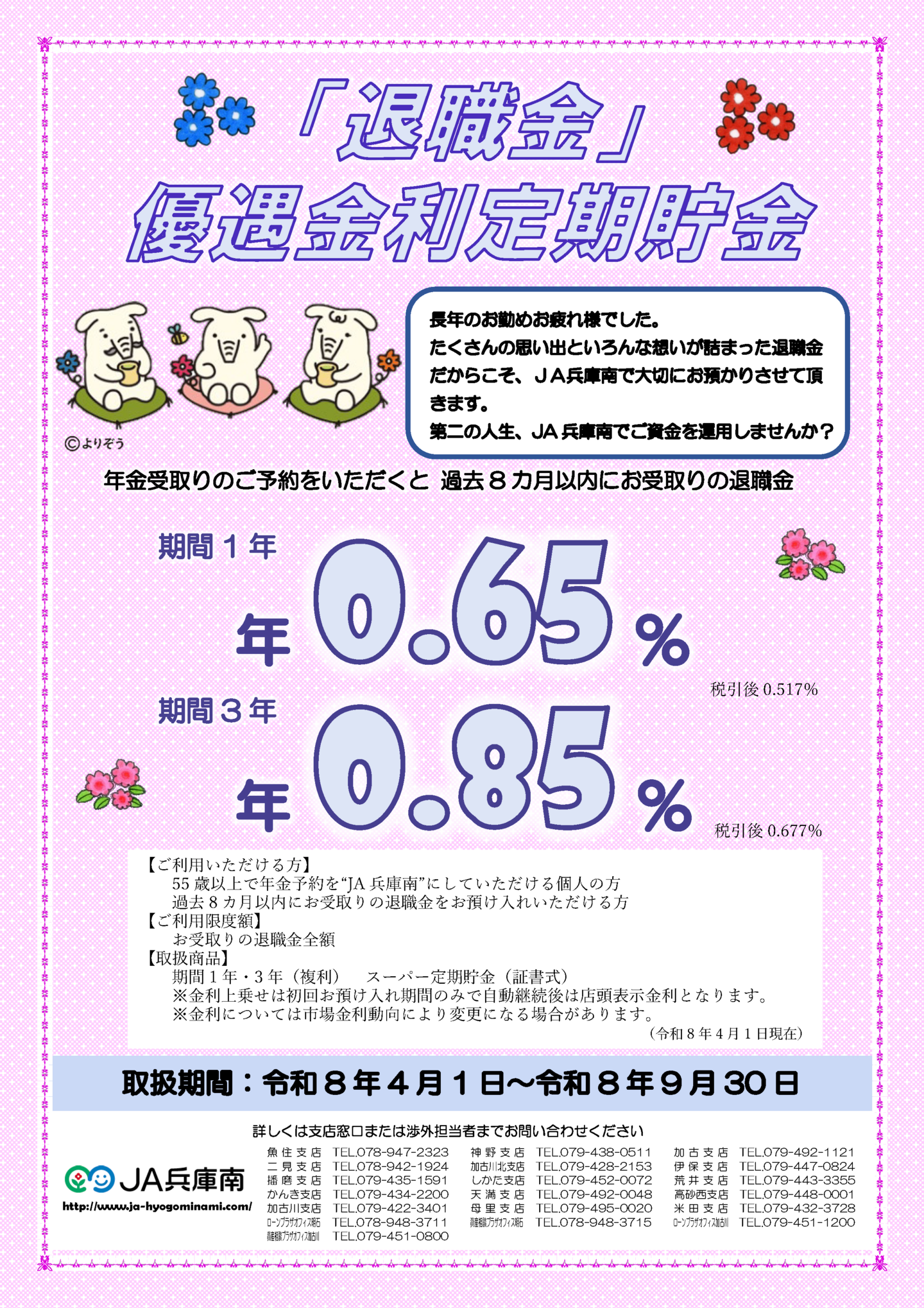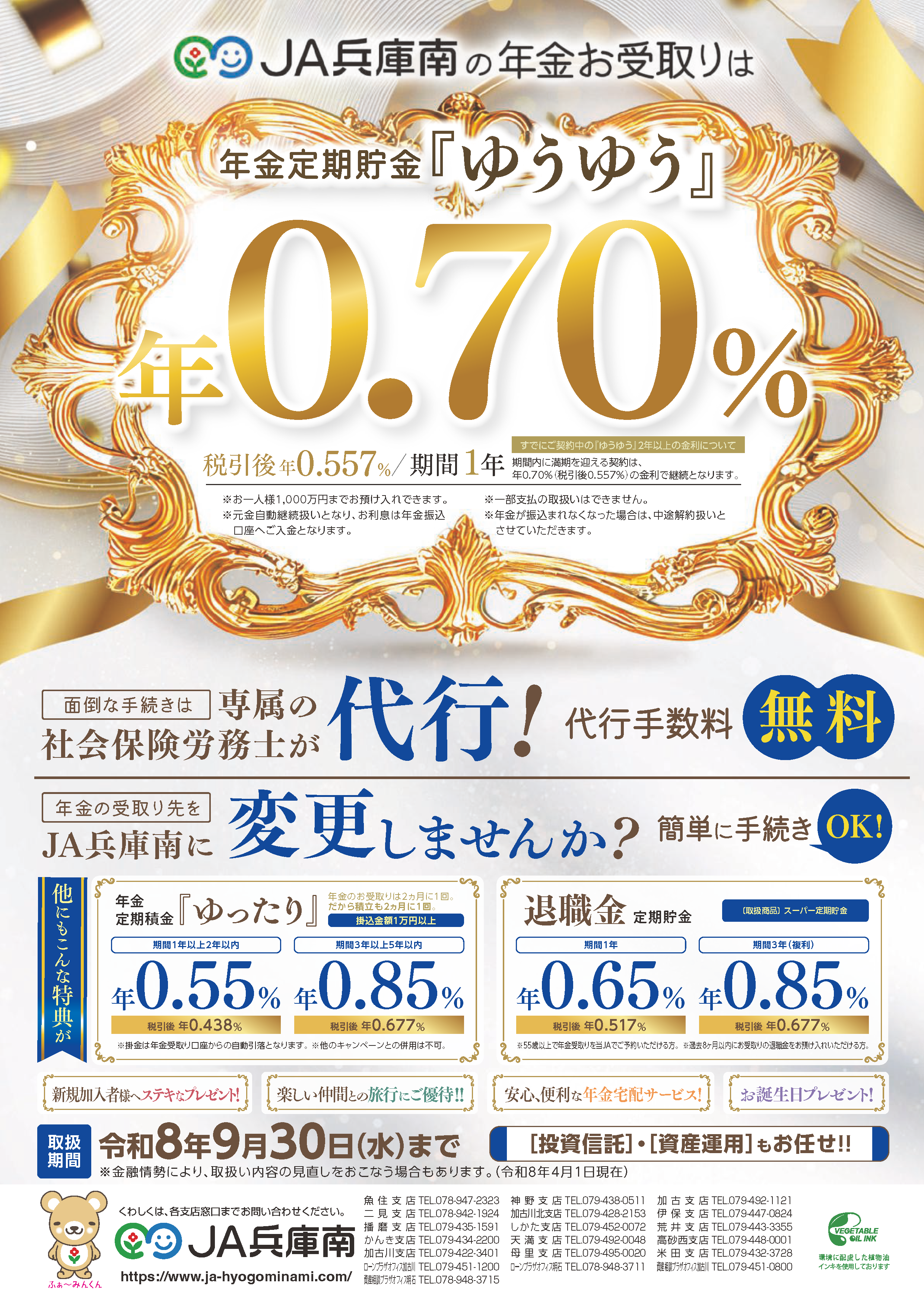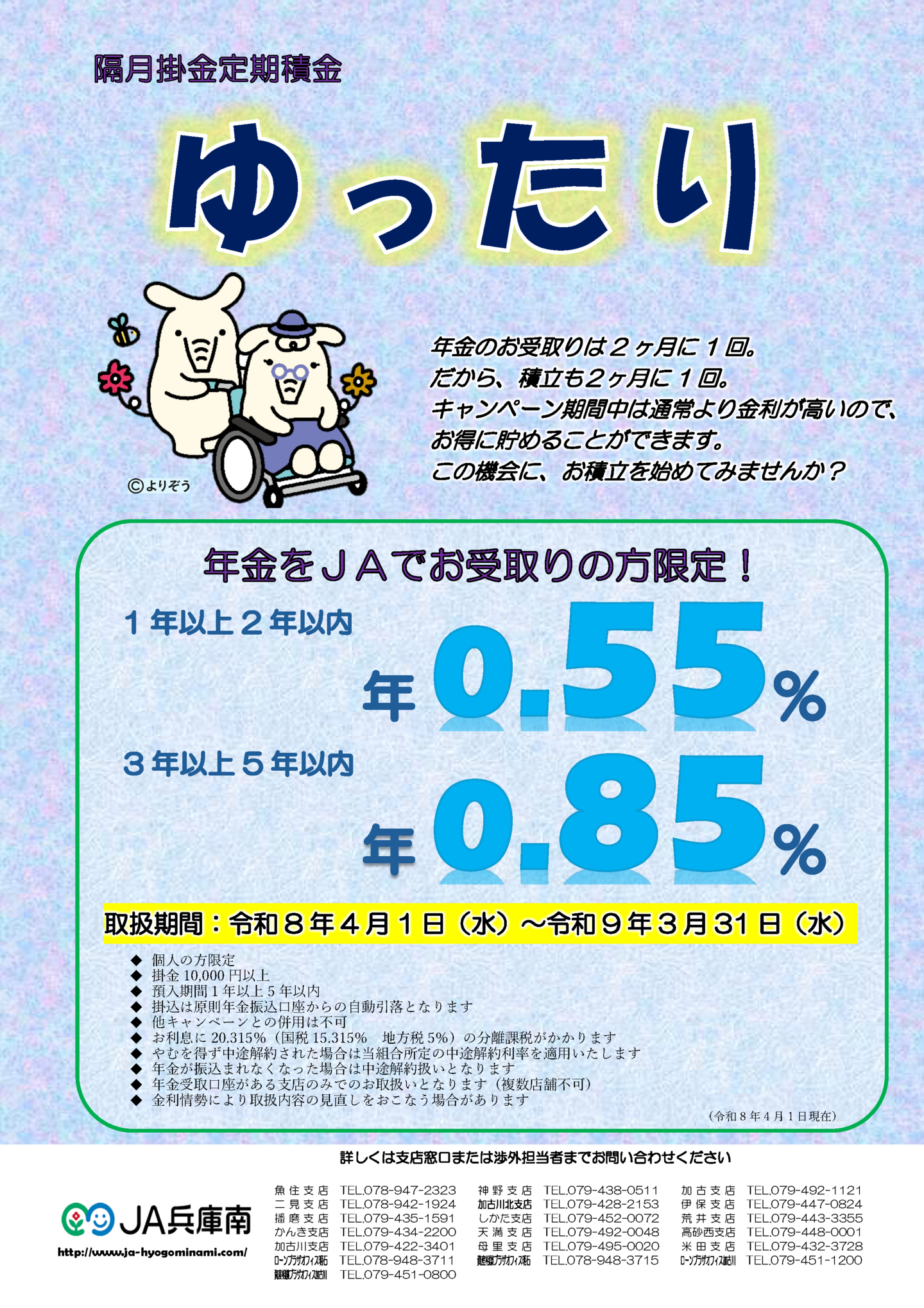 HOME > JAバンク > キャンペーン・金利優遇商品一覧 おすすめ商品 お得な定期貯金 ネットバンク・ATM定期 JAバンクアプリ JAバンクアプリプラス 退職金 相続定期貯金 はじめてのお取引き 『年金受取はJA兵庫南へ』 すでにご契約中の年金優遇定期貯金『ゆうゆう』2年以上の金利について 令和8年4月1日より満期を迎えられた方は下記の金利で自動継続となります。なお、期間等の変更につきましては、各支店窓口・渉外担当者へお問合せください。年金優遇定期貯金『ゆうゆう』 年金優遇定期貯金『ゆうゆう』 期間 金利 2年以上10年以内 0.70%(税引後0.557%) ※金融情勢により金利の見直しを行う場合もあります。(令和8 年4 月1 日現在) コツコツ貯める 子育て応援定期積金 きゅうりちゃん ゆったり 定期積金 JAの年金相談&優遇プログラム 年金無料相談会 各種ローン 住宅ローン (特約固定5年) マイカーローン (三菱UFJニコス㈱保証型) 教育ローン (三菱UFJニコス㈱保証型) JA補助金等つなぎ資金 アグリマイティー資金 (基金協会保証型) JA新規就農応援資金 (基金協会保証型)