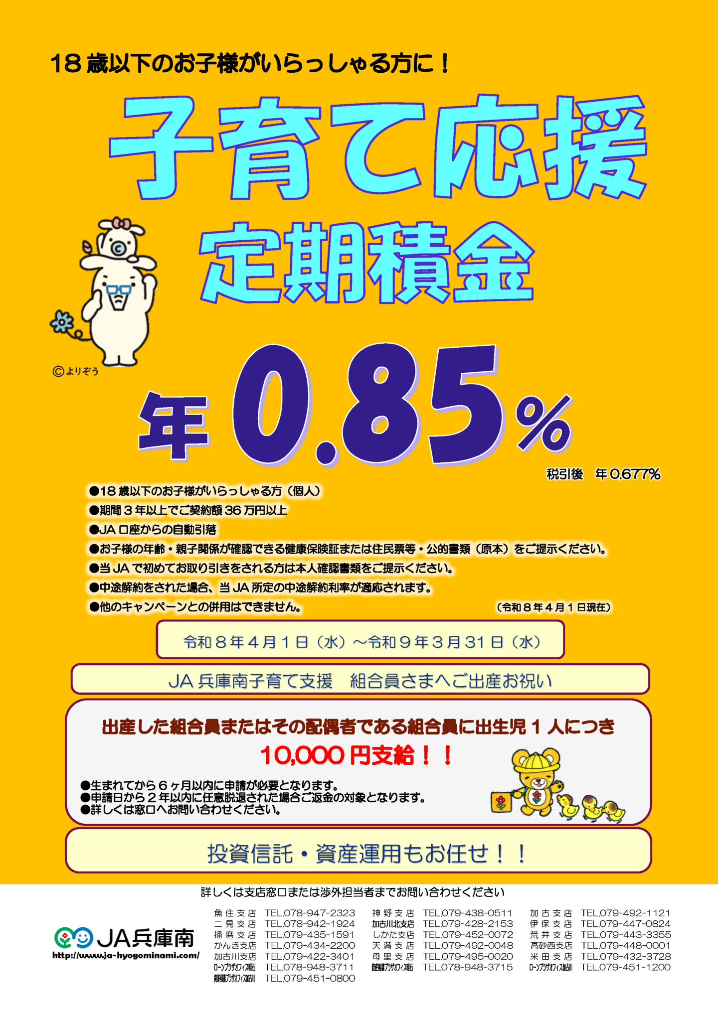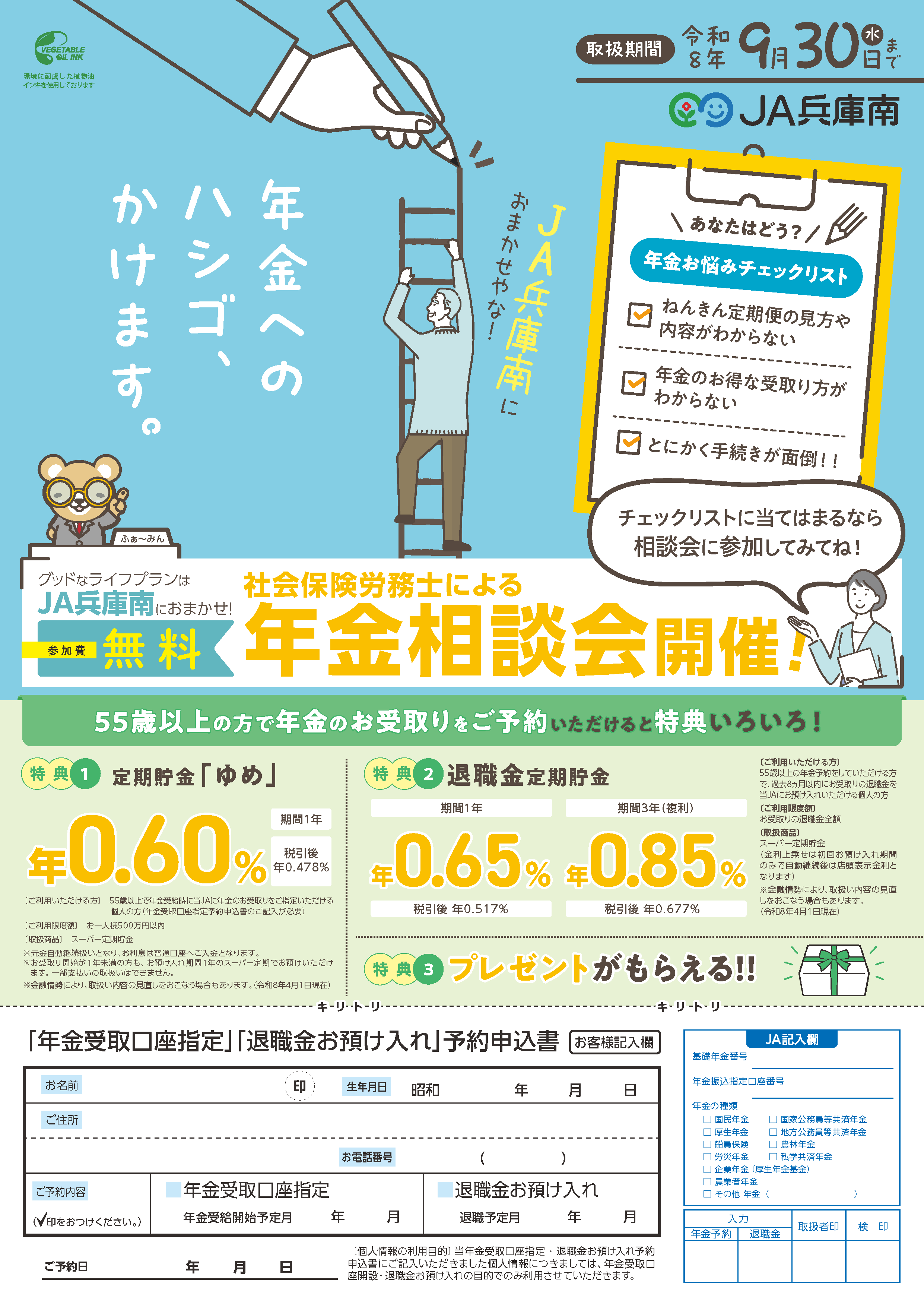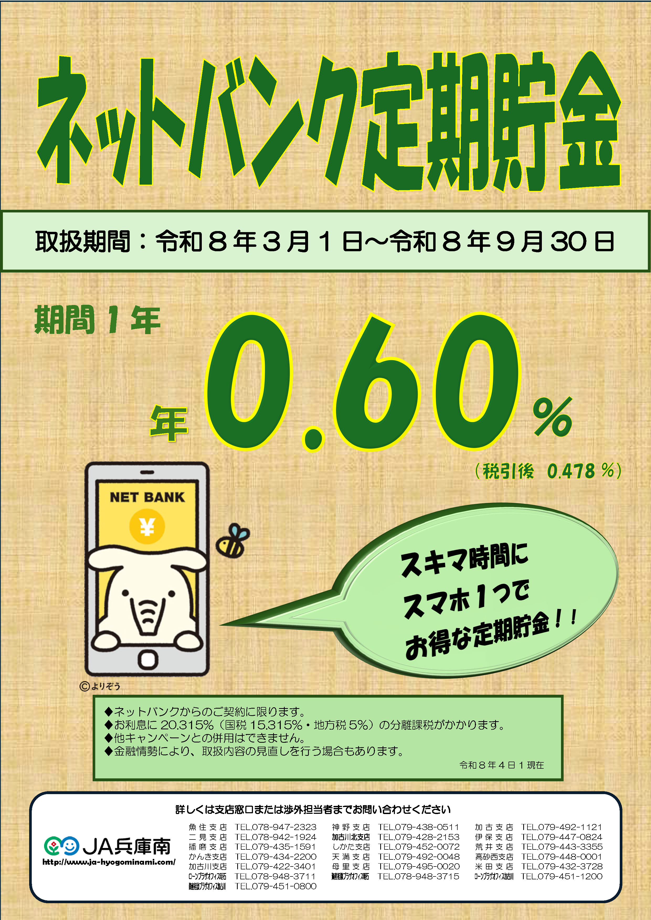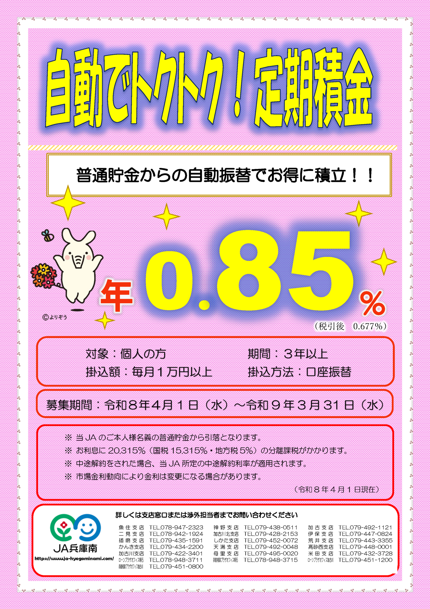 HOME > JAバンク > キャンペーン・金利優遇商品一覧 おすすめ商品 お得な定期貯金 ネットバンク・ATM定期 JAバンクアプリ JAバンクアプリプラス 退職金 相続定期貯金 はじめてのお取引き 『年金受取はJA兵庫南へ』 すでにご契約中の年金優遇定期貯金『ゆうゆう』2年以上の金利について 令和8年4月1日より満期を迎えられた方は下記の金利で自動継続となります。なお、期間等の変更につきましては、各支店窓口・渉外担当者へお問合せください。年金優遇定期貯金『ゆうゆう』 年金優遇定期貯金『ゆうゆう』 期間 金利 2年以上10年以内 0.70%(税引後0.557%) ※金融情勢により金利の見直しを行う場合もあります。(令和8 年4 月1 日現在) コツコツ貯める 子育て応援定期積金 きゅうりちゃん ゆったり 定期積金 JAの年金相談&優遇プログラム 年金無料相談会 各種ローン 住宅ローン (特約固定5年) マイカーローン (三菱UFJニコス㈱保証型) 教育ローン (三菱UFJニコス㈱保証型) JA補助金等つなぎ資金 アグリマイティー資金 (基金協会保証型) JA新規就農応援資金 (基金協会保証型)