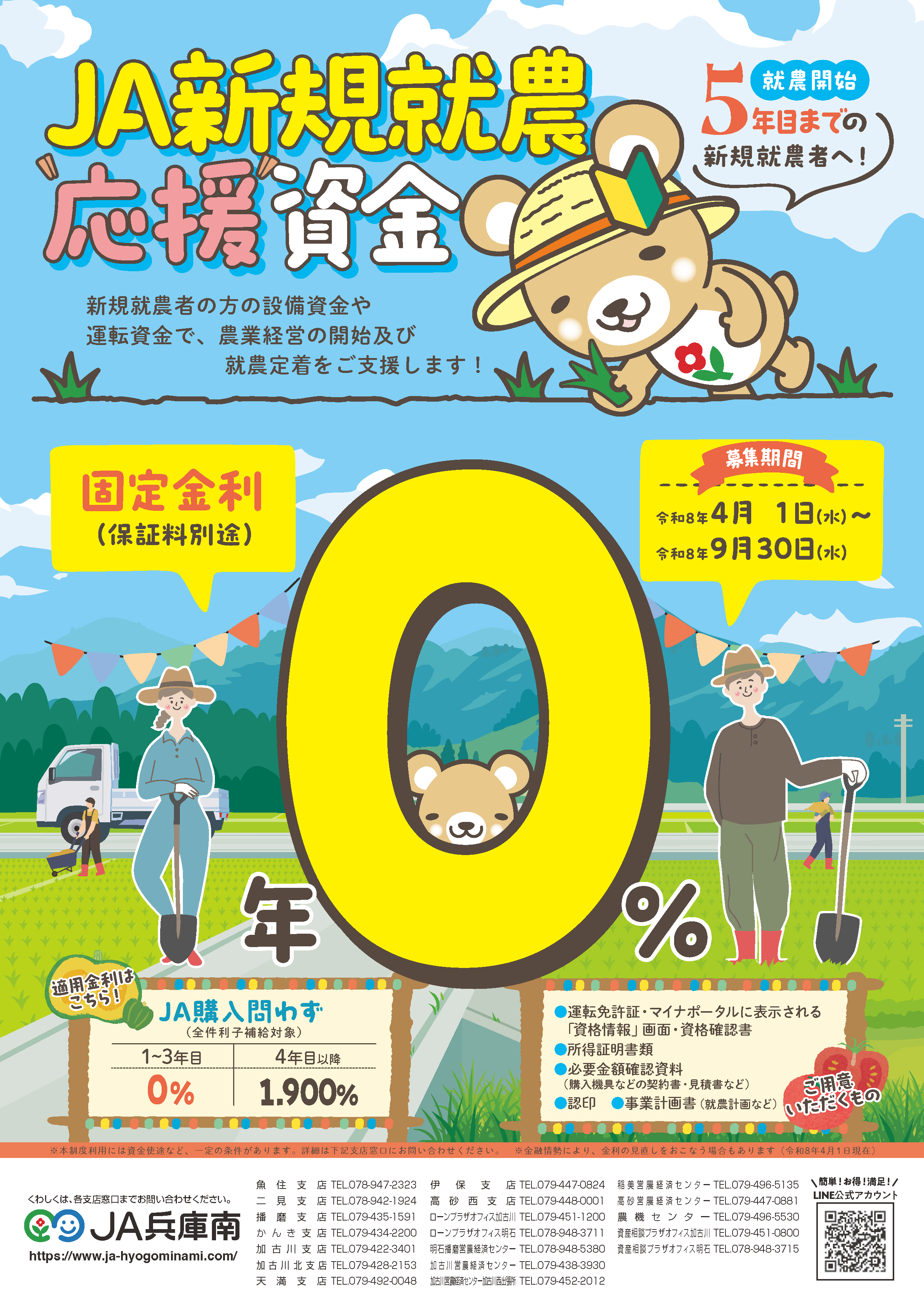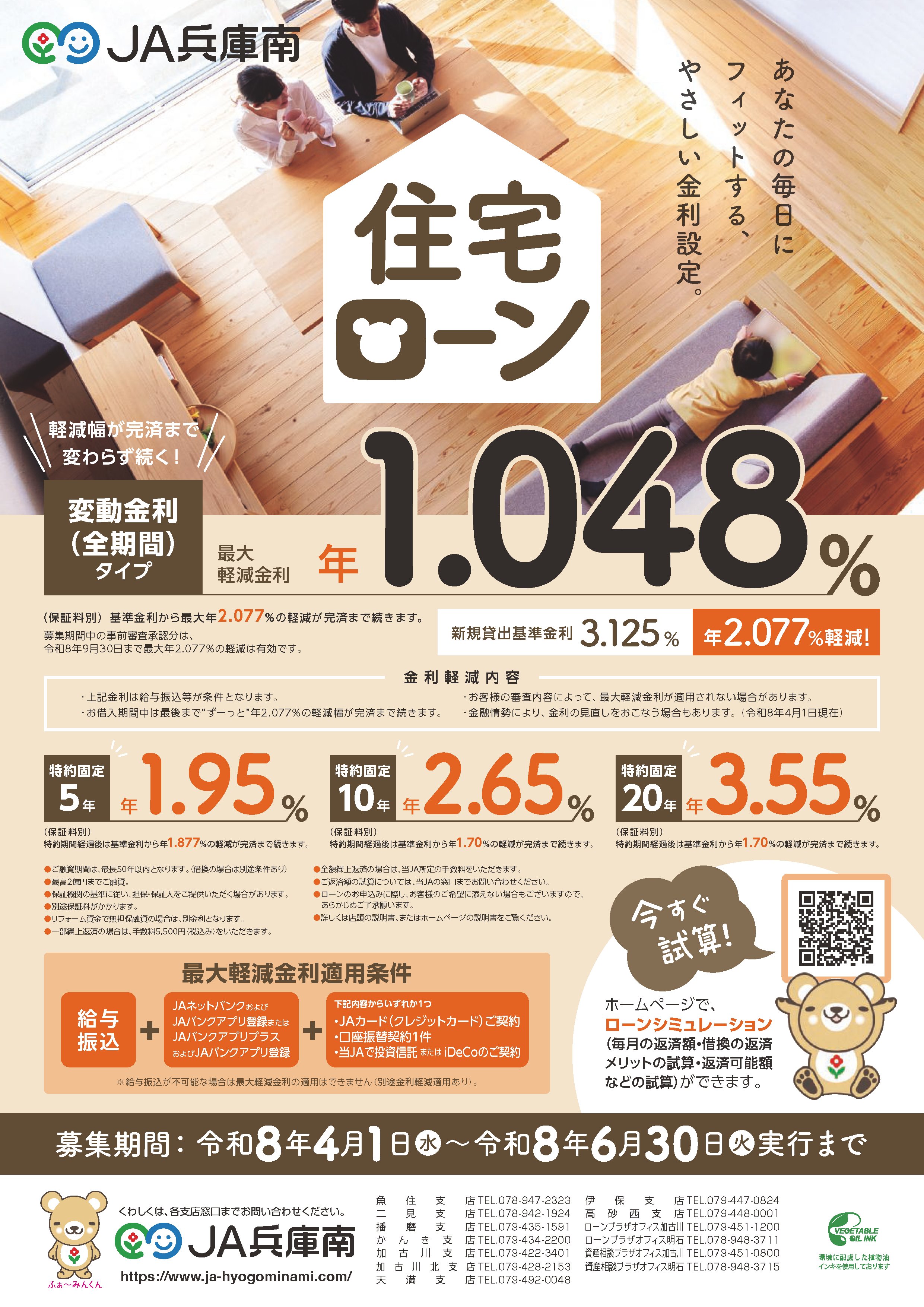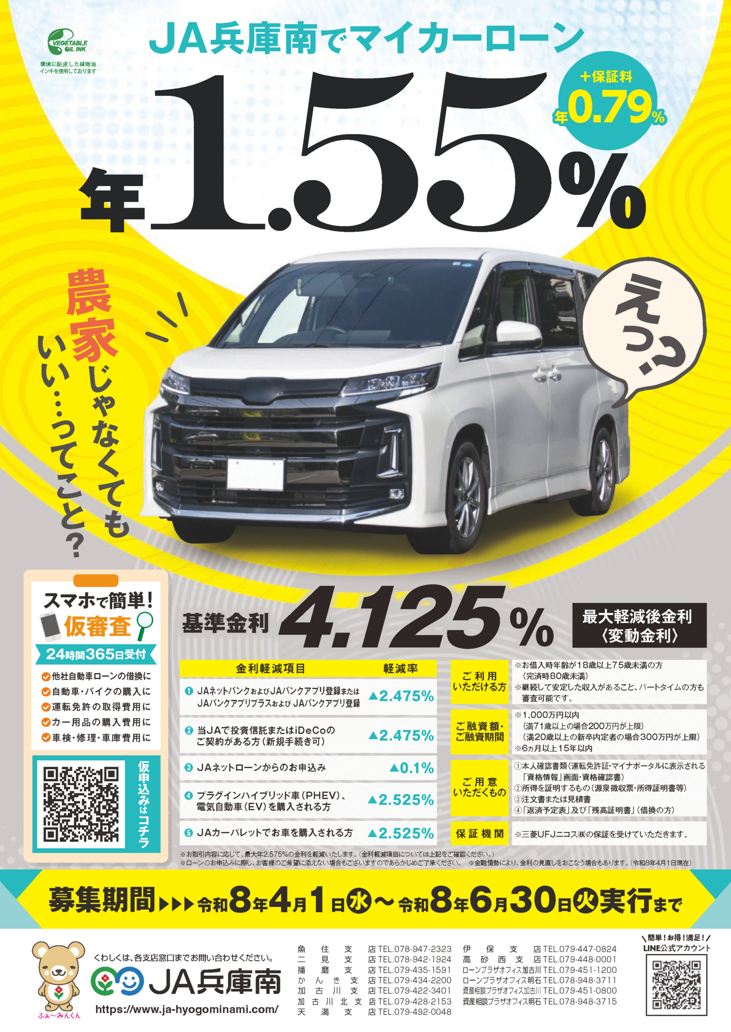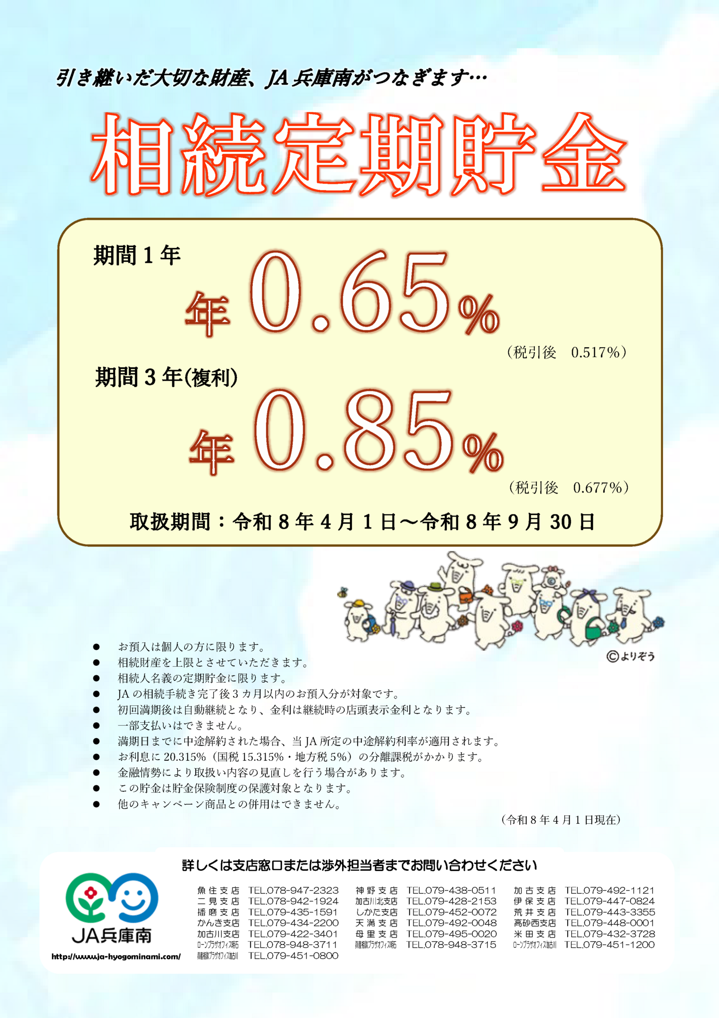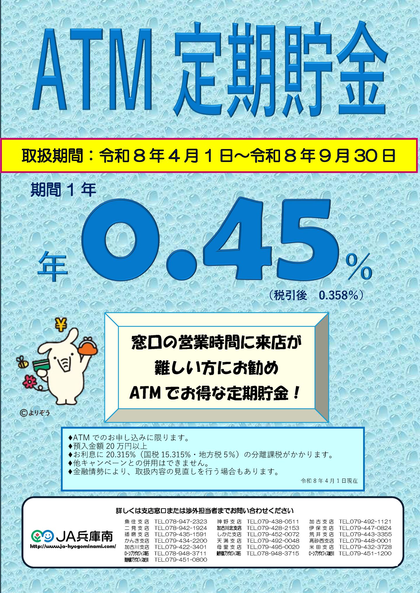 HOME > JAバンク > キャンペーン・金利優遇商品一覧 おすすめ商品 お得な定期貯金 ネットバンク・ATM定期 JAバンクアプリ JAバンクアプリプラス 退職金 相続定期貯金 はじめてのお取引き 『年金受取はJA兵庫南へ』 すでにご契約中の年金優遇定期貯金『ゆうゆう』2年以上の金利について 令和8年4月1日より満期を迎えられた方は下記の金利で自動継続となります。なお、期間等の変更につきましては、各支店窓口・渉外担当者へお問合せください。年金優遇定期貯金『ゆうゆう』 年金優遇定期貯金『ゆうゆう』 期間 金利 2年以上10年以内 0.70%(税引後0.557%) ※金融情勢により金利の見直しを行う場合もあります。(令和8 年4 月1 日現在) コツコツ貯める 子育て応援定期積金 きゅうりちゃん ゆったり 定期積金 JAの年金相談&優遇プログラム 年金無料相談会 各種ローン 住宅ローン (特約固定5年) マイカーローン (三菱UFJニコス㈱保証型) 教育ローン (三菱UFJニコス㈱保証型) JA補助金等つなぎ資金 アグリマイティー資金 (基金協会保証型) JA新規就農応援資金 (基金協会保証型)