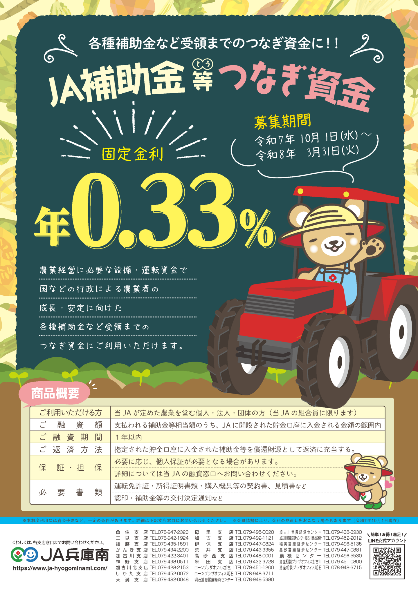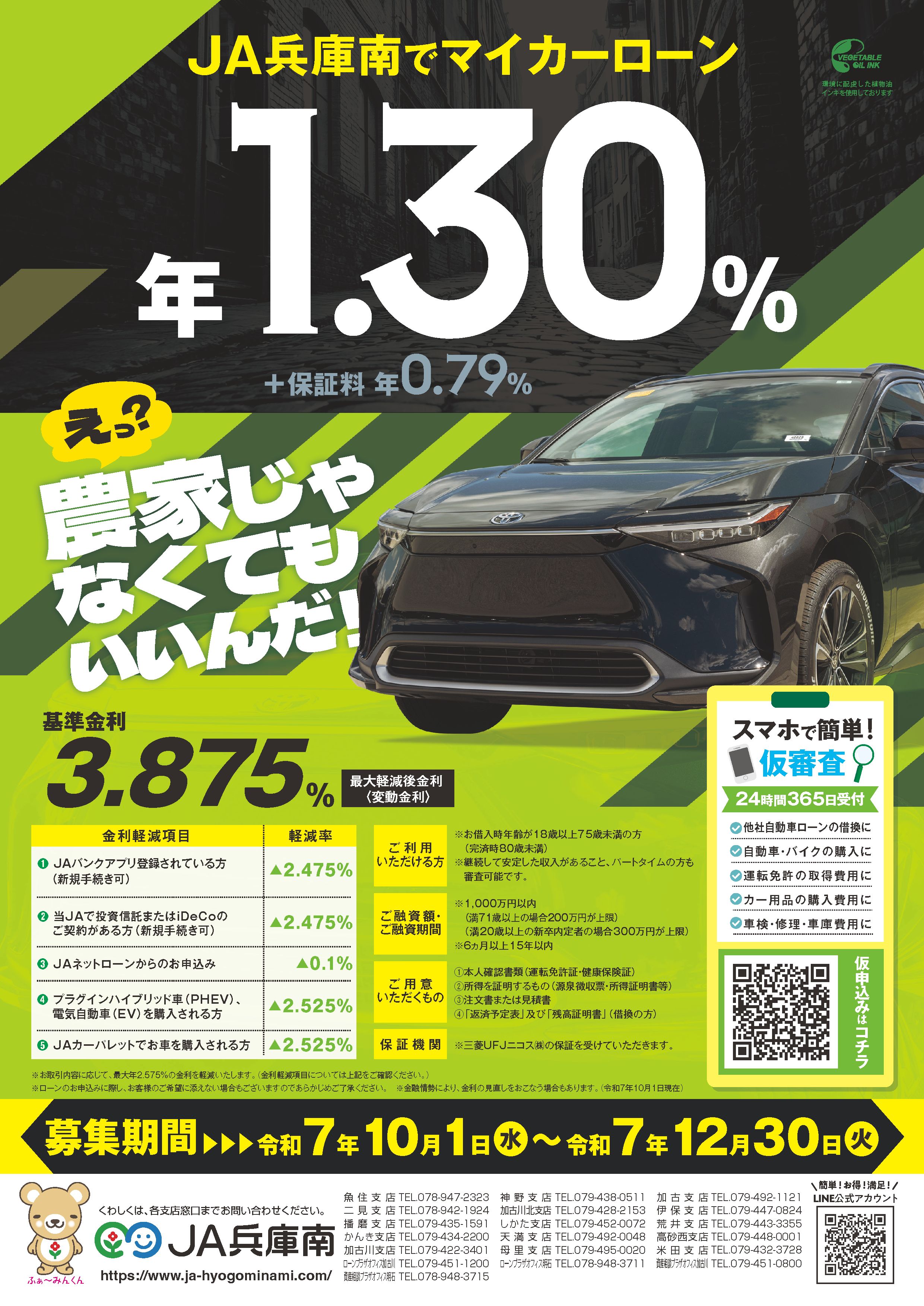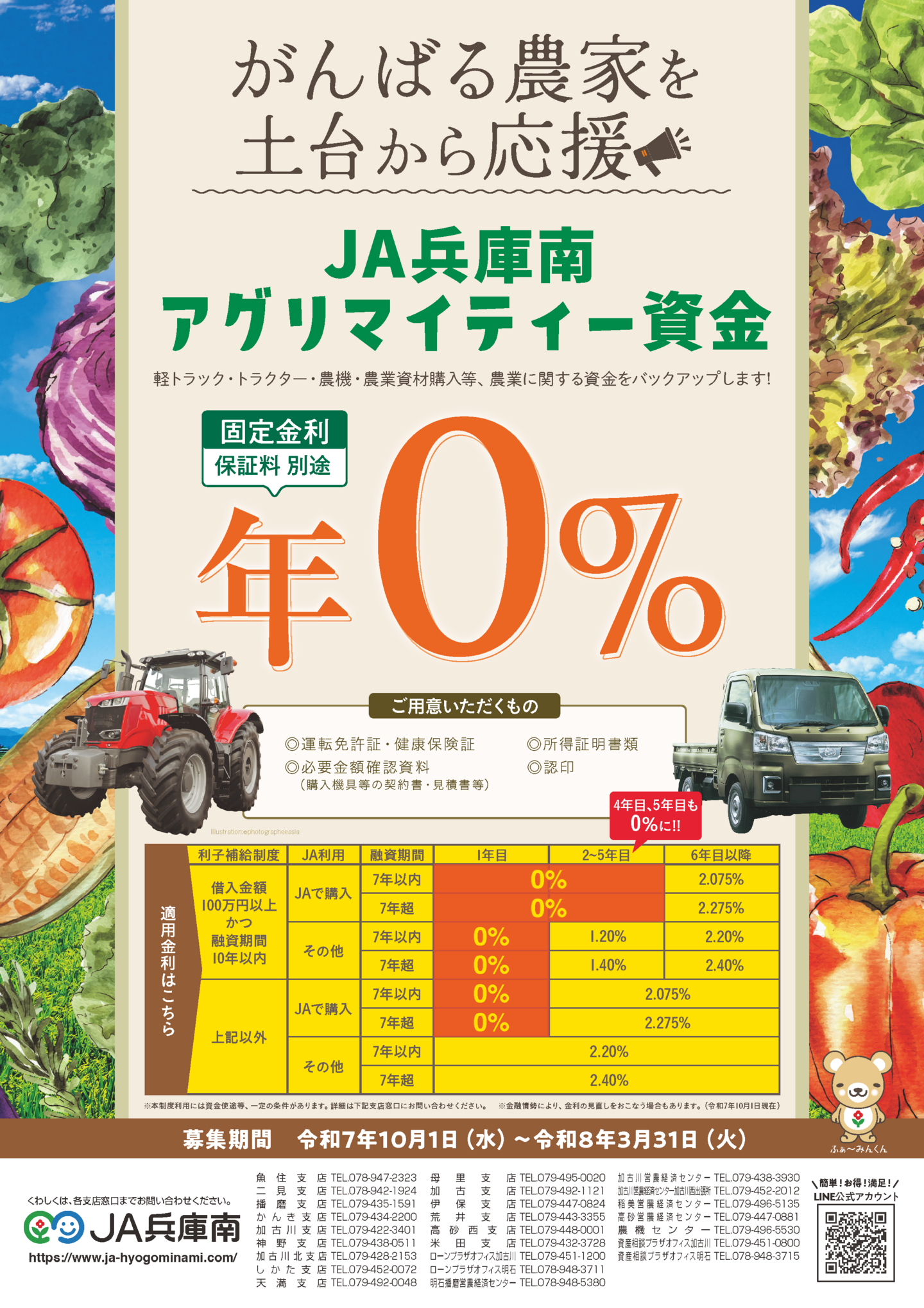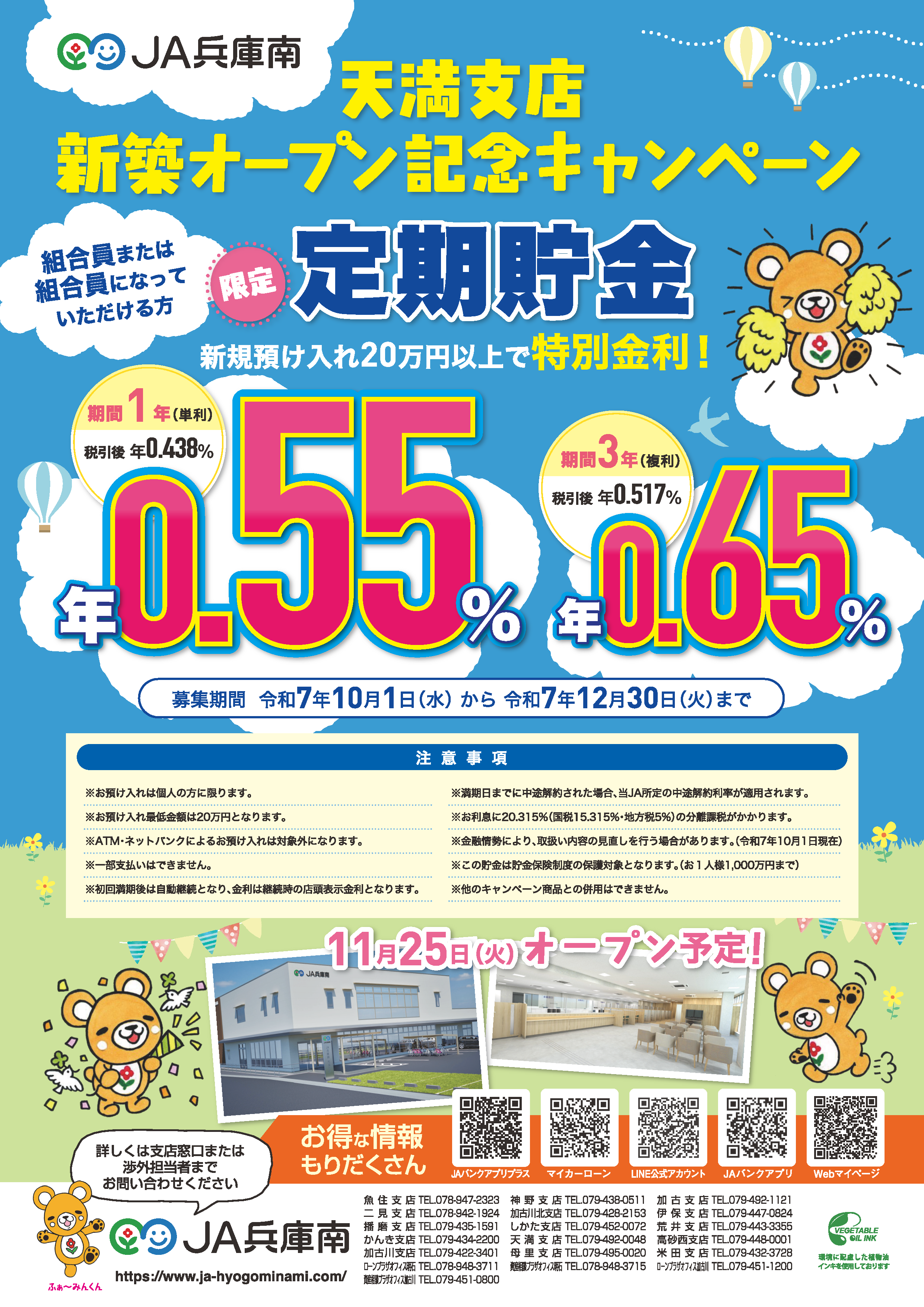 HOME > JAバンク > キャンペーン・金利優遇商品一覧 ★JA兵庫南★~天満支店オープン記念キャンペーン~ 募集期間 令和7年 10月1日(水)~令和7年12月30日(火)まで . お得な定期貯金 ネットバンク・ATM定期 JAバンクアプリ JAバンクアプリプラス 退職金 相続定期貯金 はじめてのお取引き 『年金受取はJA兵庫南へ』 すでにご契約中の年金優遇定期貯金『ゆうゆう』2年以上の金利について 令和7年4月1日より満期を迎えられた方は下記の金利で自動継続となります。なお、期間等の変更につきましては、各支店窓口・渉外担当者へお問合せください。年金優遇定期貯金『ゆうゆう』 年金優遇定期貯金『ゆうゆう』 期間 金利 2年以上10年以内 0.55%(税引後0.438%) 1年 0.55%(税引後0.438%) ※金融情勢により金利の見直しを行う場合もあります。(令和7 年4 月1 日現在) コツコツ貯める 子育て応援定期積金 きゅうりちゃん ゆったり 定期積金 JAの年金相談&優遇プログラム 年金無料相談会 各種ローン 住宅ローン (特約固定5年) マイカーローン (三菱UFJニコス㈱保証型) 教育ローン (三菱UFJニコス㈱保証型) アグリマイティー資金 (基金協会保証型) JA新規就農応援資金 (基金協会保証型) JA補助金等つなぎ資金