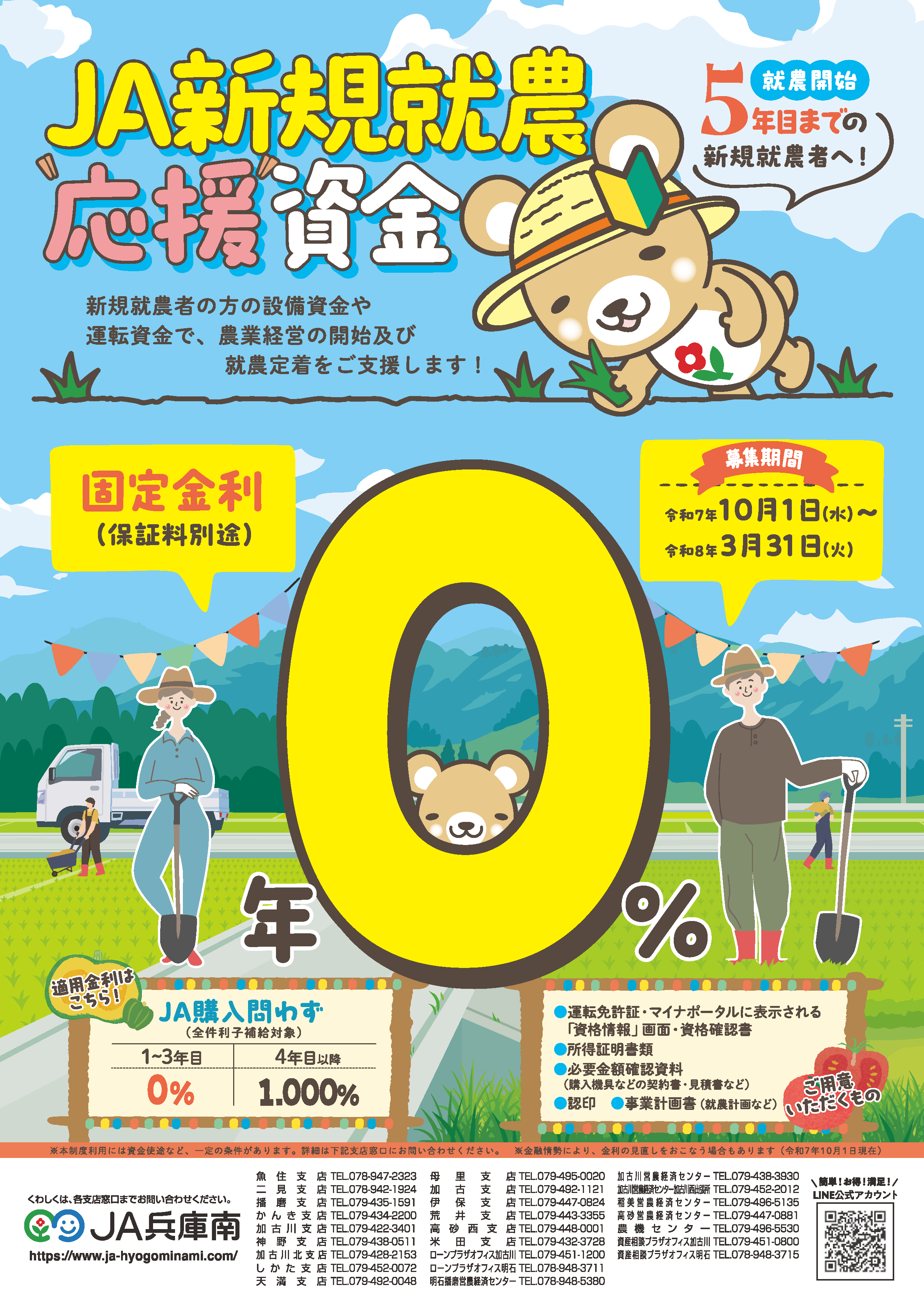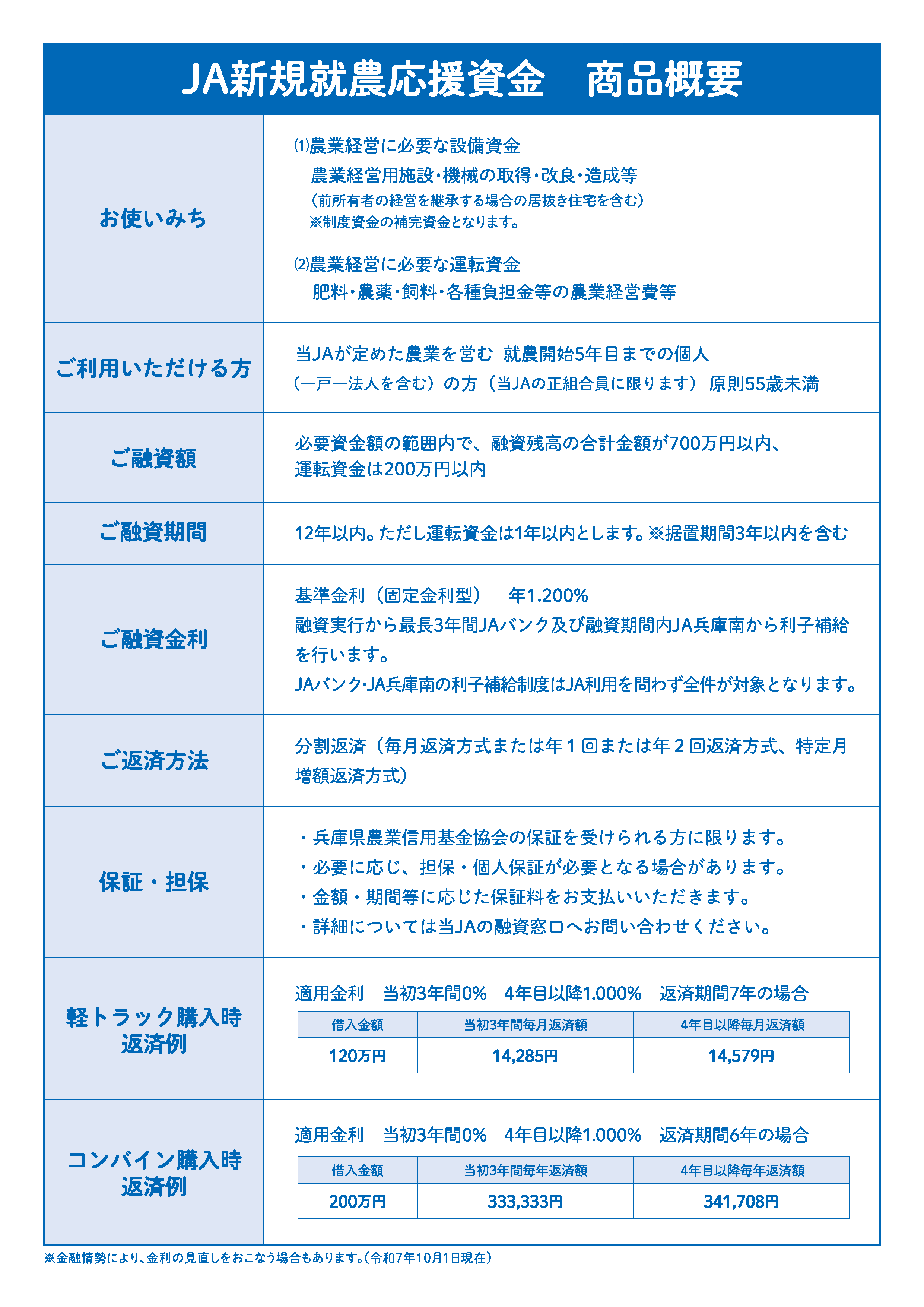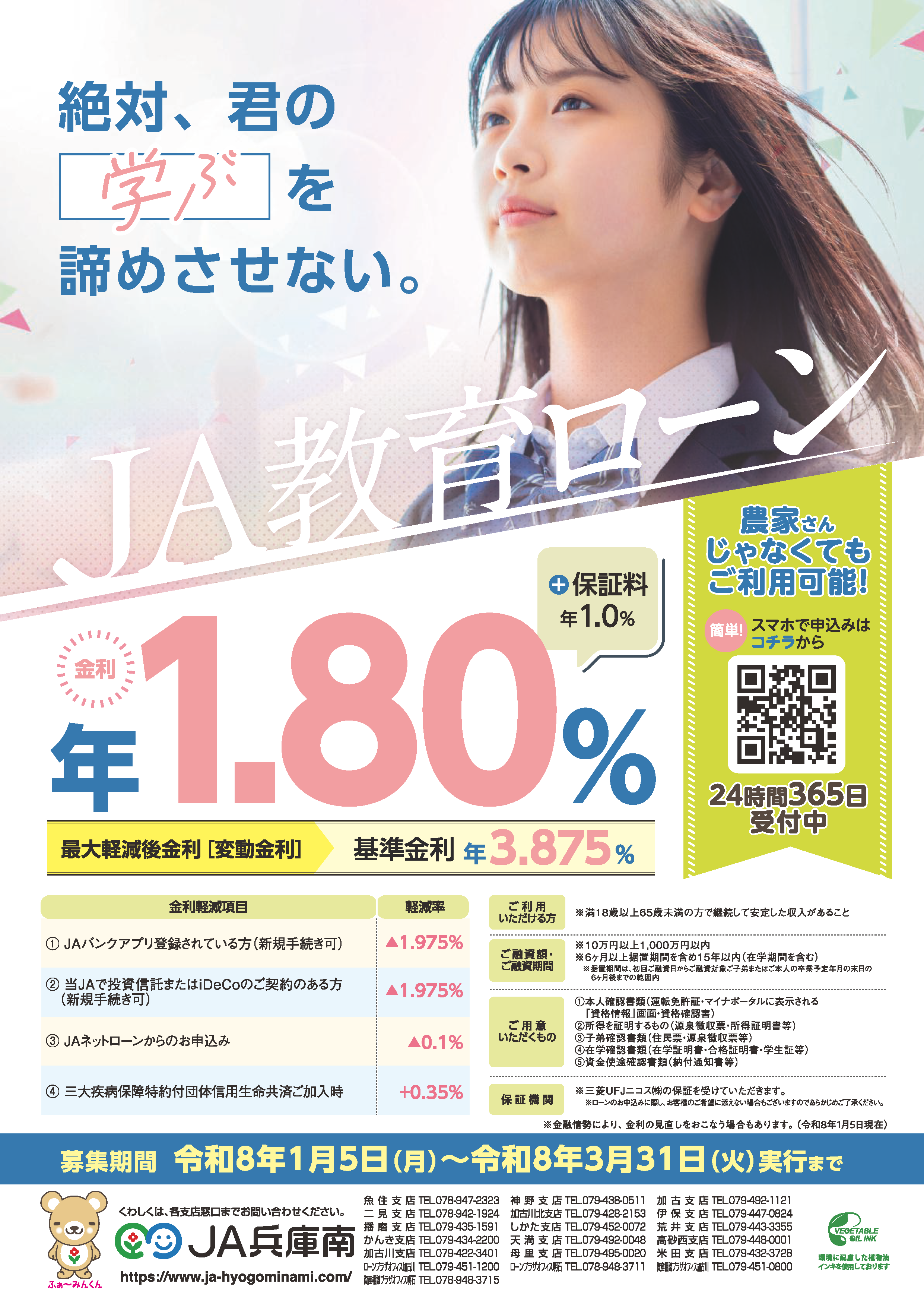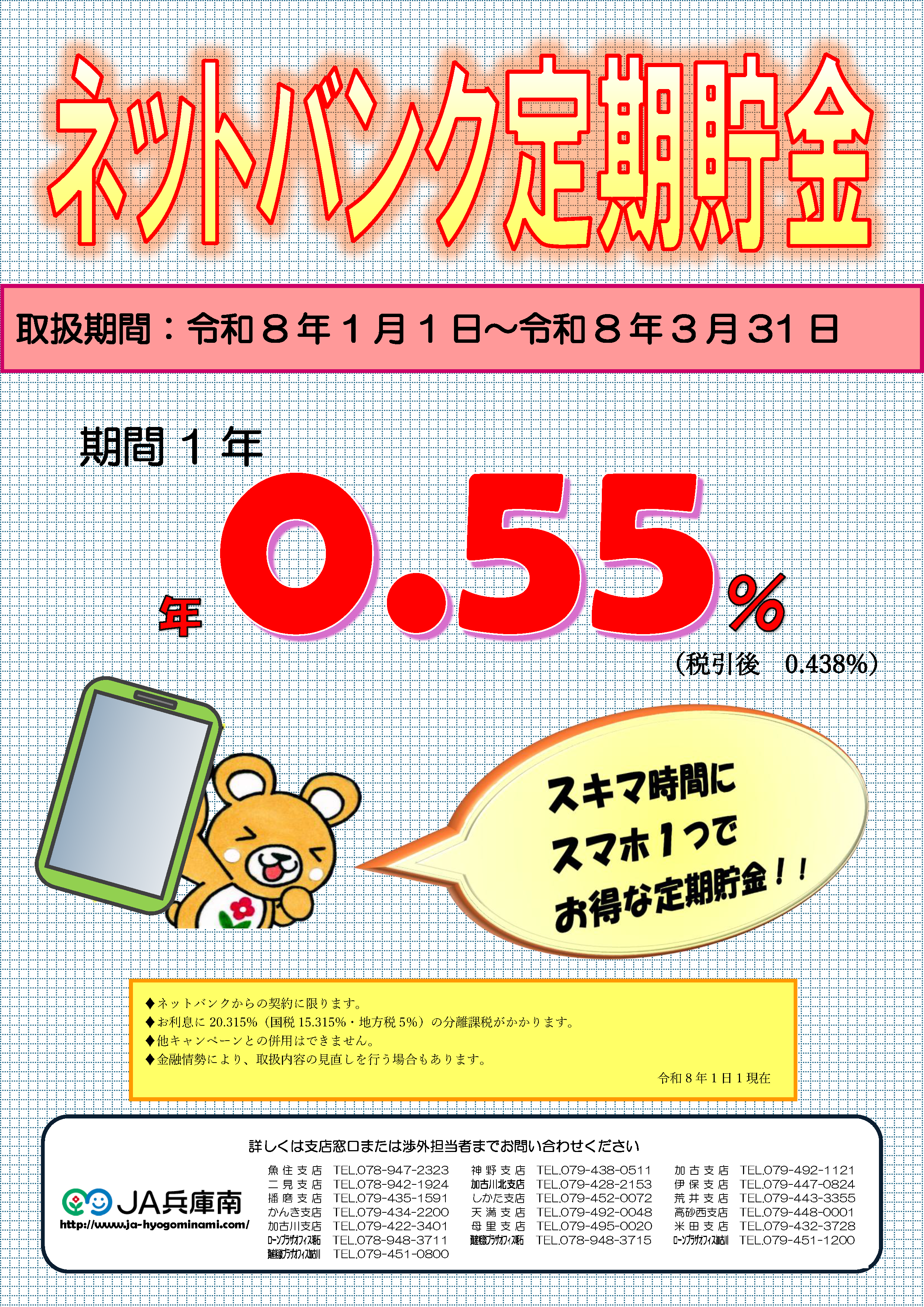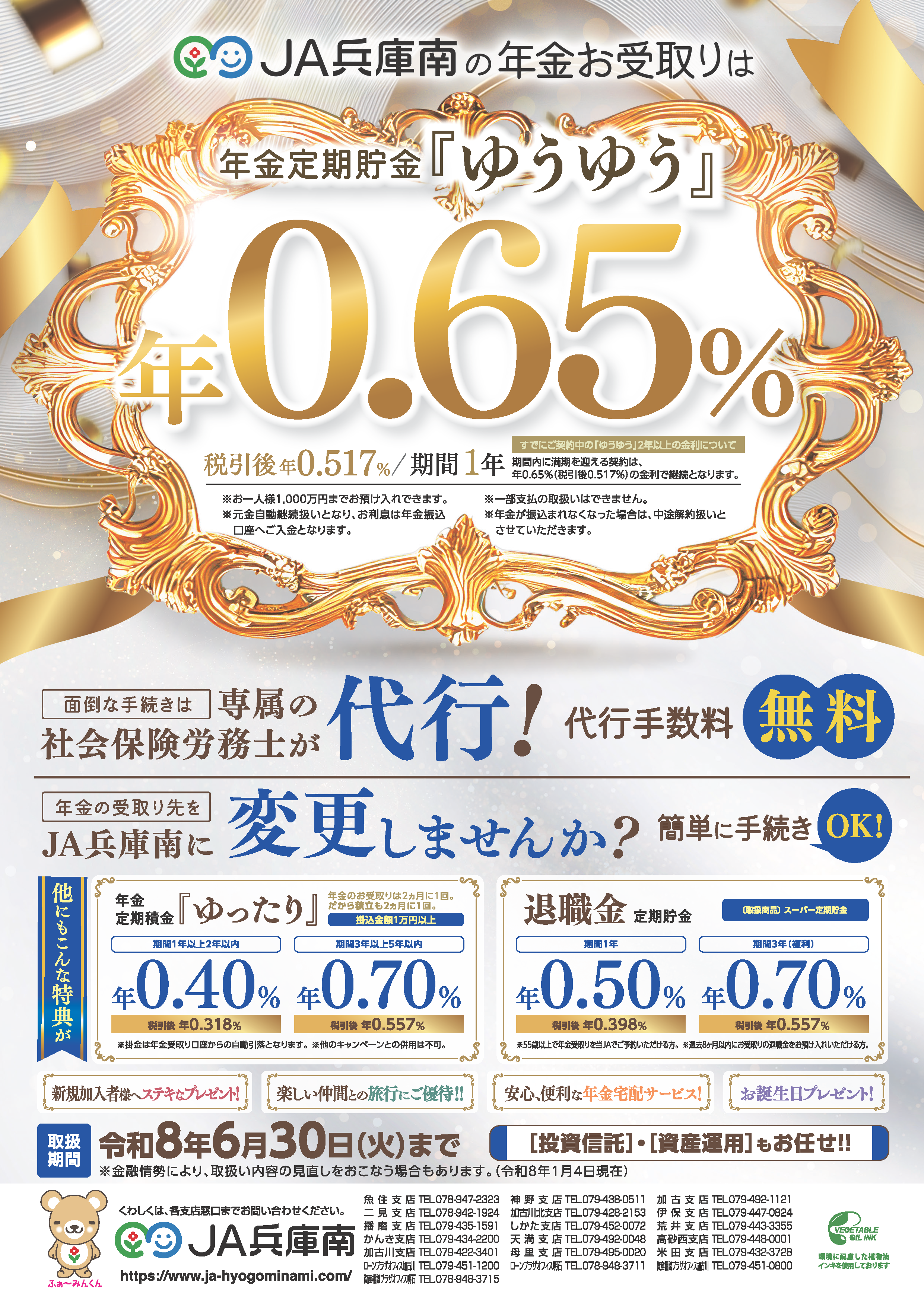 HOME > JAバンク > キャンペーン・金利優遇商品一覧 ~定期貯金特別キャンペーン~ 募集期間 令和7年11月25日(火)~令和8年1月9日(金)まで お得な定期貯金 ネットバンク・ATM定期 JAバンクアプリ JAバンクアプリプラス 退職金 相続定期貯金 はじめてのお取引き 『年金受取はJA兵庫南へ』 すでにご契約中の年金優遇定期貯金『ゆうゆう』2年以上の金利について 令和8年1月4日より満期を迎えられた方は下記の金利で自動継続となります。なお、期間等の変更につきましては、各支店窓口・渉外担当者へお問合せください。年金優遇定期貯金『ゆうゆう』 年金優遇定期貯金『ゆうゆう』 期間 金利 2年以上10年以内 0.65%(税引後0.517%) 1年 0.65%(税引後0.517%) ※金融情勢により金利の見直しを行う場合もあります。(令和8 年1 月4 日現在) コツコツ貯める 子育て応援定期積金 きゅうりちゃん ゆったり 定期積金 JAの年金相談&優遇プログラム 年金無料相談会 各種ローン 住宅ローン (特約固定5年) マイカーローン (三菱UFJニコス㈱保証型) 教育ローン (三菱UFJニコス㈱保証型) JA補助金等つなぎ資金 アグリマイティー資金 (基金協会保証型) JA新規就農応援資金 (基金協会保証型)