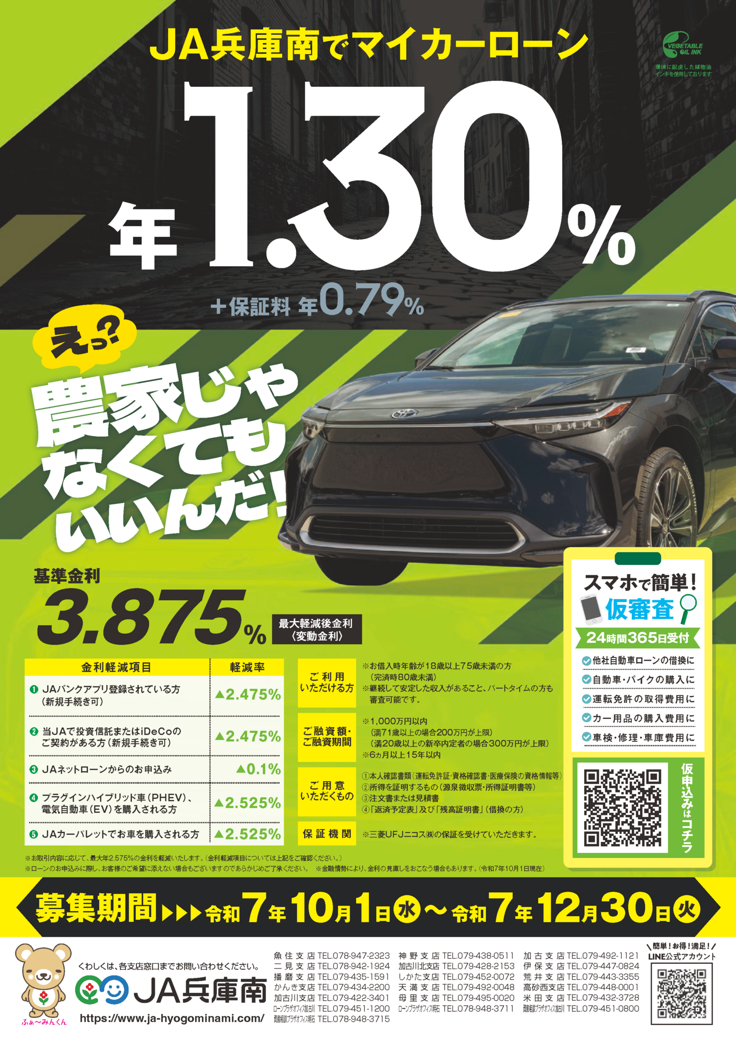 | ご融資利率 | ・基準金利(変動金利) 年3.875% ・ネットバンクのご利用他、JAとのお取引により最大軽減金利適用中 最大2.375%軽減 |