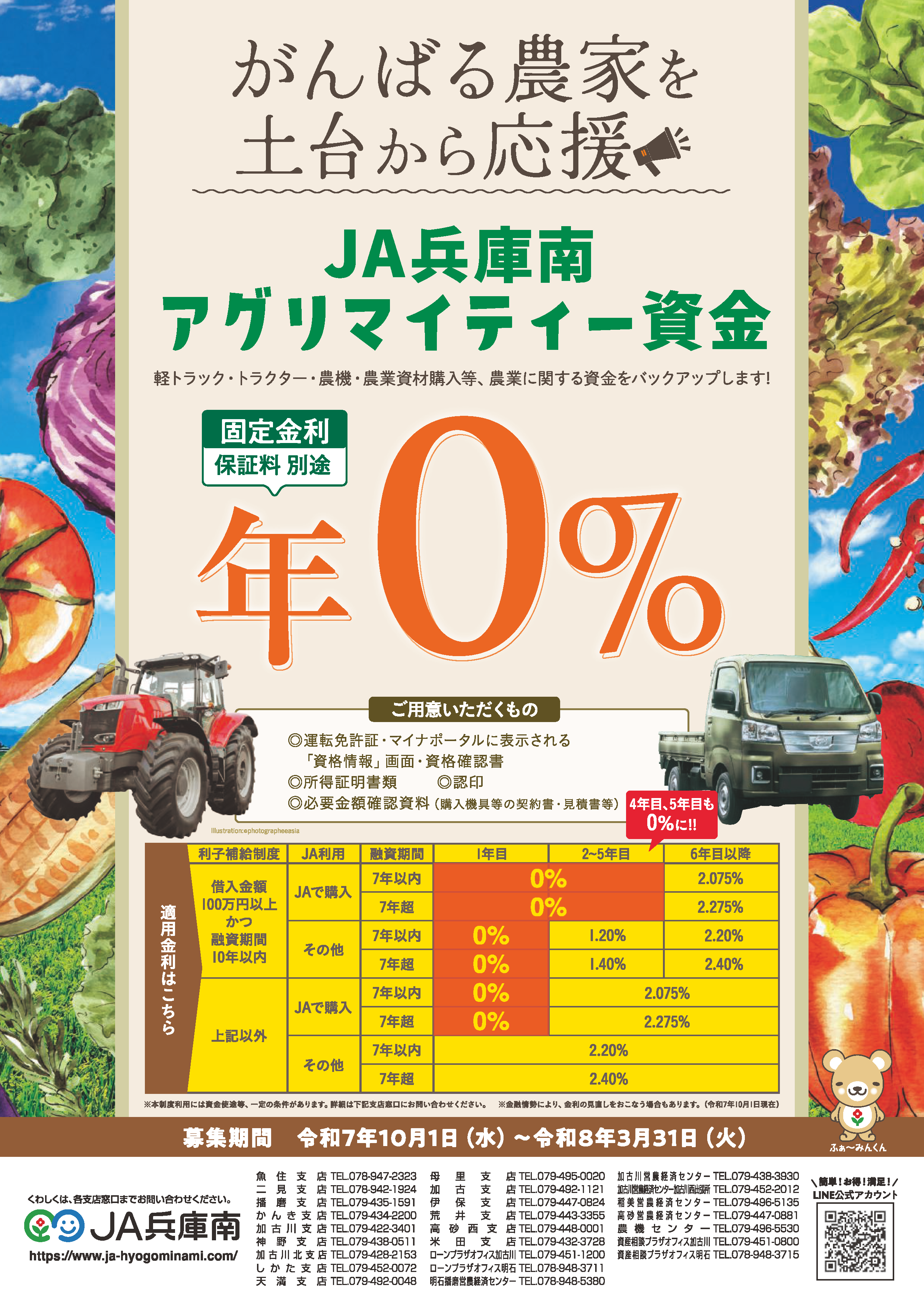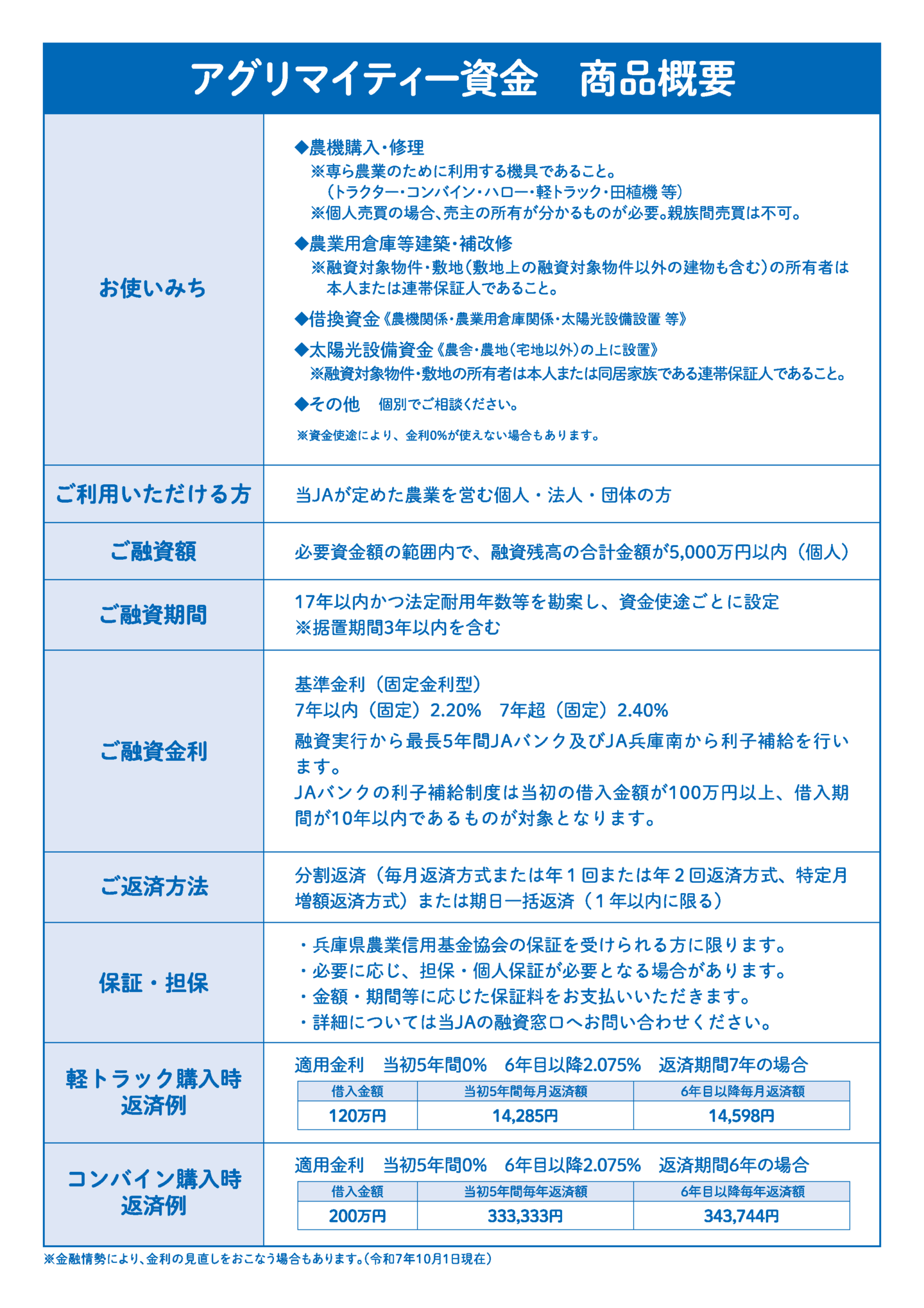 | 担保・保証料 | 兵庫県農業信用基金協会の保証を受けられる方に限ります 必要に応じ、担保・個人保証が必要となる場合があります 金額・期間等に応じた保証料をお支払いいただきます 詳細については当JAの融資窓口へお問い合わせください |