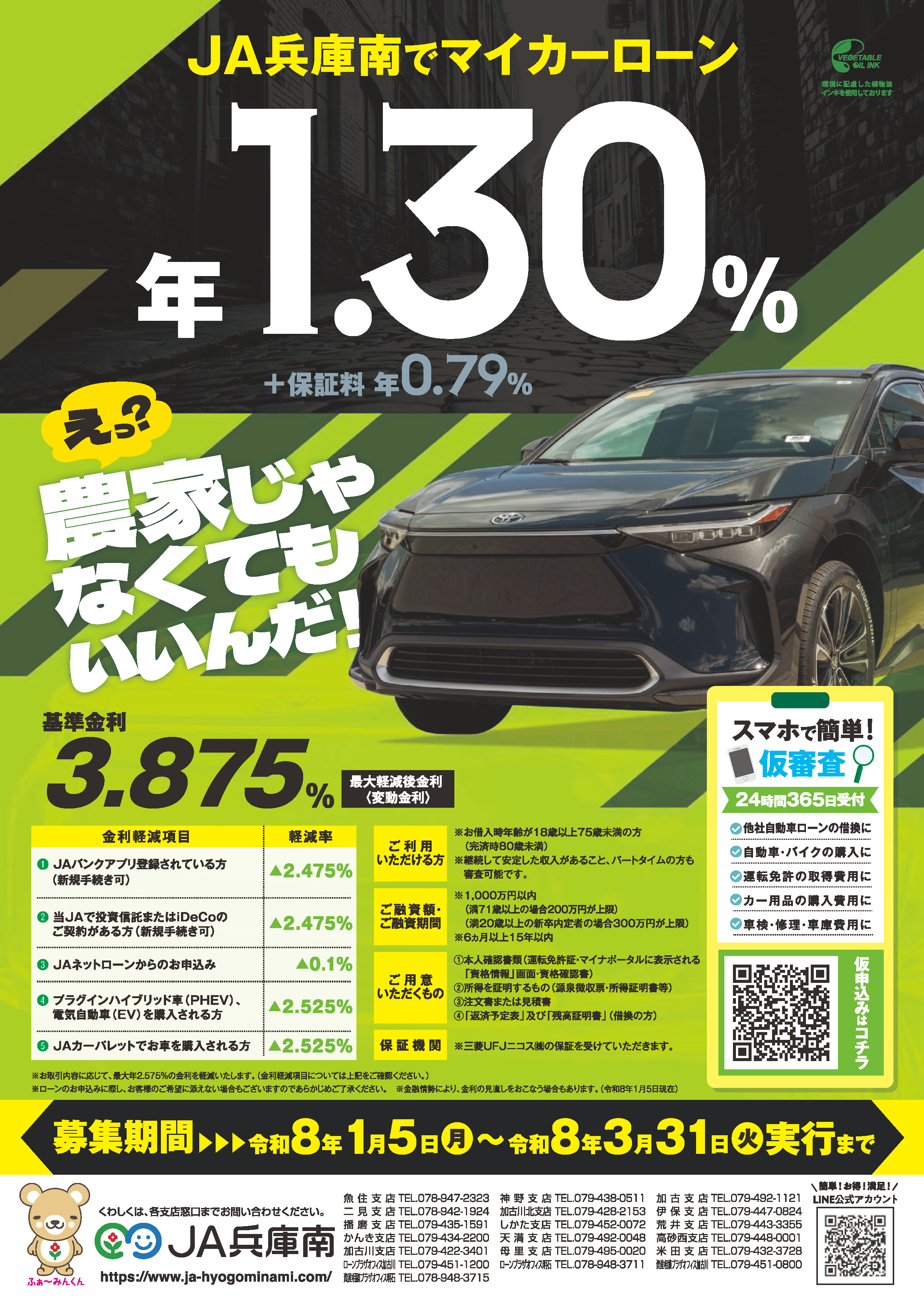 | ご融資利率 | ・基準金利(変動金利) 年3.875% ・ネットバンクのご利用他、JAとのお取引により最大軽減金利適用中 最大2.375%軽減 |
